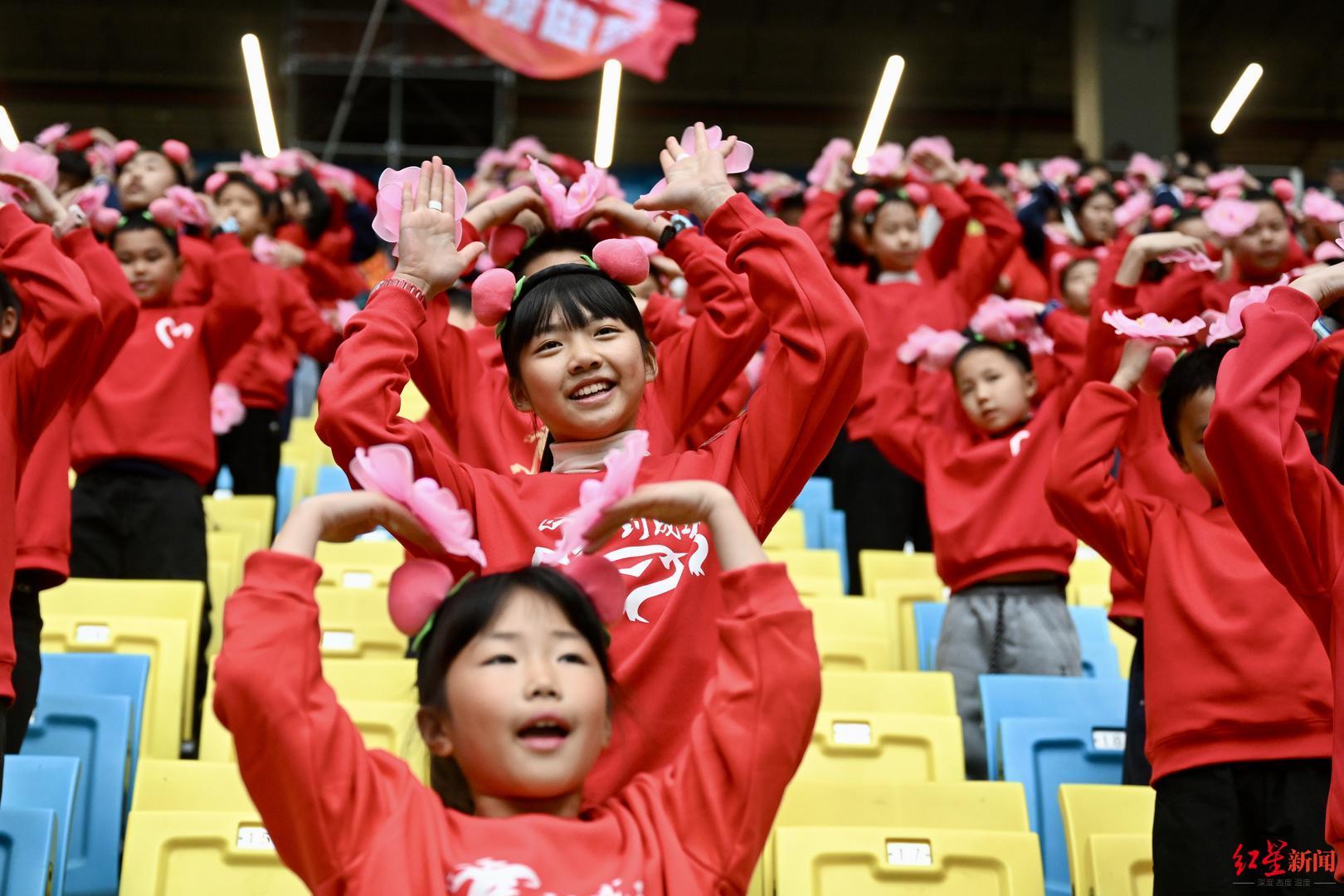 今晚的凤凰山,“公益”也是一大主题。蓉城主场固定的公益看台邀请了近600位来自龙泉驿各中小学的同学们,目前正是龙泉驿桃花烂漫时,同学们有的戴着桃子形状的头套,有的戴着桃子发箍。来自成都市龙泉驿区师上学校的高鹏睿是学校足球队的队员,他也借这次来到凤凰山的机会向成都市民发出邀约:“希望这个春天,大家能到龙泉驿区赏花。”